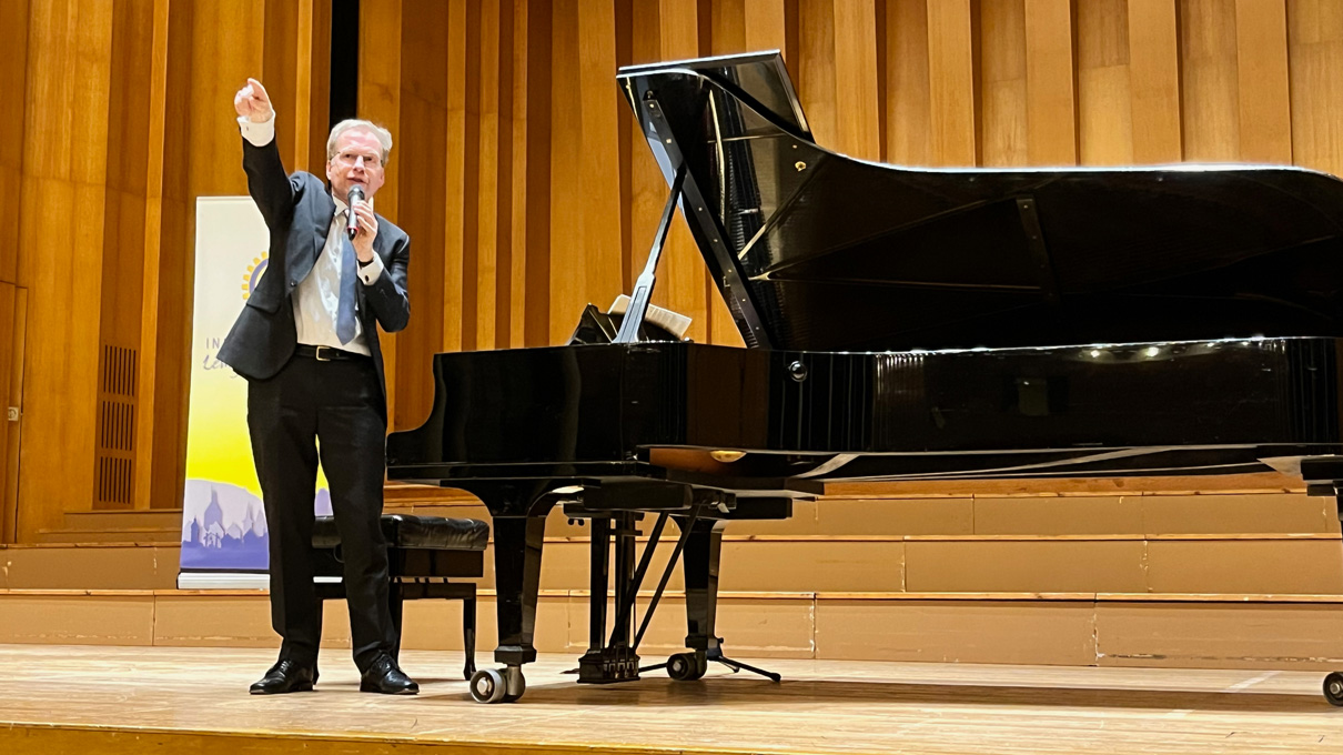 Aus den eigens für die Veranstaltung zusammengestellten Liederheften konnte das Publikum durch Zuruf Stücke auswählen, die dann von Burkhard Schmidt am Klavier kommentiert und begleitet wurden.